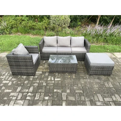 General description This PE rattan outdoor furniture set is an excellent addition to your patio or garden. It is made of high-quality PE rattan and features a durable galvanized steel construction, ensuring sturdiness and longevity. This garden furniture set can be left outdoors all year round. Technical specifications 1 x Three Seater Sofa: 177W x 65D x 66H cm 1 x Chair: 74W x 65D x 66H cm 1 x Oblong Table: 85L x 50W x 37H cm 1 x Big Footstool: 65L x 65W x 35H cm Sofa Weight Capacity: 250 kg Table Weight Capacity: 80 kg Color: Dark grey mixed rattan with dark grey fabric Installation Items come flat packed and are easy to assemble. Sturdy galvanized steel tube metal frames with powder coating to prevent rust. Usage Keep the cushions indoors or use a rain cover when not in use. For long-term storage, cover the furniture with a rain cover. 8 cm thick seat cushions with soft pillow back cushions provide added comfort. Other information 5 mm thickness transparent tempered glass with