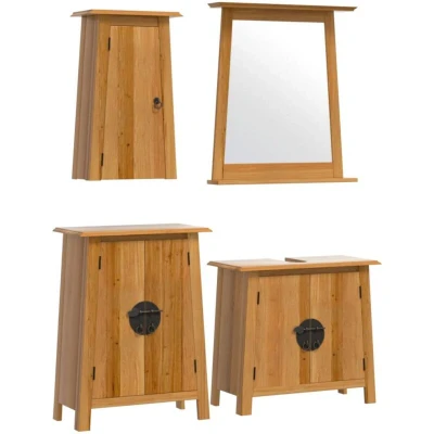 ManoManoGeneral description This 4 Piece Bathroom Furniture Set is an excellent addition to your bathroom, providing a tidy and striking appearance. Made from solid pine wood, it features a beautiful natural material with a straight grain and rustic knots, ensuring each piece is unique. Technical specifications Material: Solid pine wood Sink cabinet dimensions: 70 x 32 x 63 cm (W x D x H) Side cabinet dimensions: 59 x 32 x 80 cm (W x D x H) Wall cabinet dimensions: 42 x 23 x 70 cm (W x D x H) Mirror dimensions: 70 x 12 x 79 cm (W x D x H) Assembly required: Yes Usage The bath cabinet offers ample space for essential toiletries and bath items such as soaps, shampoo, and toothpaste. The metal handles allow for easy access to the bathroom storage cabinet. The wall-mounted function of the bathroom wall cabinet maximizes floor space and keeps the area clean. The mirror provides a clear and non-distorted reflection, suitable for makeup, shaving, or checking your outfit before going out. Other
