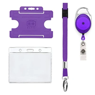 4 Piece ID Badge Set Purple Includes Metal Lobster Clip Lanyard, Retractable Reel, & Pocket Card Holder, 8 Colours PCL Media ltd