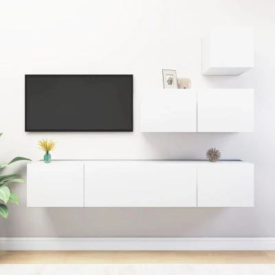 General description This 4 Piece TV Cabinet Set in White features a modern design and ample storage space, making it a focal point of your living room. Made of sturdy and durable engineered wood, this hanging cabinet set is attached to the wall, providing a timeless addition to your home. With several compartments, it is ideal for storing magazines, DVDs, and other items. Cleaning is easy with just a damp cloth. Technical specifications Colour: White Material: Engineered wood Assembly required: Yes Dimensions: 1 x TV cabinet: 30.5 x 30 x 30 cm (W x D x H) 3 x TV cabinet: 80 x 30 x 30 cm (W x D x H) SKU: 3078736 Other information