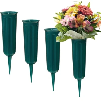 Plastic Grave Vases Bulk: This set contains 4 pieces cemetery vases with spikes, you can conveniently decorate multiple graves or sites all at once. The premium plastic flower holders for cemetery have pretty great value Solid and Durable Material: Our grave vases for cemetery are well made from high-quality plastic. Not only has it super sturdy material, but has very solid construction. The sharp spikes make you insert the flower vases into the soil quite easily and quickly Unique and Elegant Design: The grave vase uses the appropriate color to create a classic concave shape, retro and elegant, allowing you to create a beautiful commemorative flower decoration for the deceased, expressing your deep thoughts and condolences Easy to Use: You only need to insert the spike into the bottom of the plastic cemetery vase, directly full of flowers or plastic flowers. Then you can smoothly insert the vases into the graveside or other places you want Widely Applicable:The flower cemetery vases with spikes are suitable for commemorating the decoration, such as memorial day, funerals, graves and other outdoor, practical and beautiful, but also can be used for outdoor parties and special events decoration