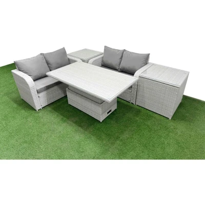 4 Seater Outdoor Love Sofa Set Rattan Garden Furniture with Adjustable Lifting Dining or Coffee Table 2 Side Tables Light Grey Fimous