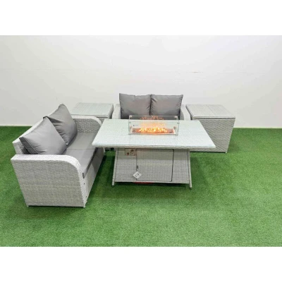 4 Seater Outdoor Love Sofa Set Rattan Garden Furniture with Firepit Dining Table 2 Side Tables Light Grey Fimous