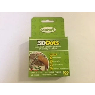 4 Packs U-Craft branded 3D glue dots. 1 Roll of 100 dots per pack. Permanent, extra strength glue dots. 3D glue dots are the invisible replacement for glue, tack, glue sticks, adhesive tapes and drawing pins. 3D Glue dots are thick, transparent dots of glue. Approx. size: 10mm diameter x 3mm depth. 3D Glue dots will stick almost anything including paper, wood, plastic, metal, glass and painted surfaces. Perfect for sticking pictures, photos, timetables, small posters, menus, notices, decorations and wrapping paper. Ideal for photo albums, card making, scrapbooking and decoupage. Easy and simple to use. Instant fixing - no drying time. Acid and lignin free. Double sided. Non yellowing. No heat or equipment required. Manufacturer part number: 201064. Barcode 5060048422108