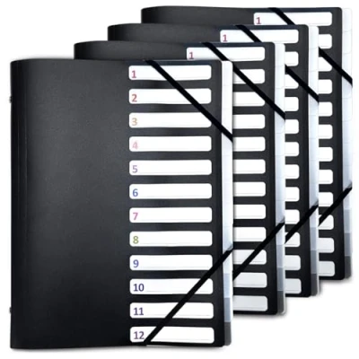 VALUE SAVING PACK: Set of 4 A4 file folders with 12 dividers each for well-organized filing at a reduced price. EFFECTIVE RANKING: EFFECTIVE AND IDENTIFIABLE ORGANIZING: 12 numbered compartments with interchangeable customizable label on the cover to easily organize courses, folders and invoices. HIGH RESISTANCE MATERIAL: Made of sturdy black polypropylene with a thick cover of 0.45 mm ensuring excellent durability and optimal protection. SECURE CLOSURE: Strong elastic closure system to keep your documents securely in place and secure your files when you're on the go. ADDITIONAL STORAGE: Each folder has a back cover equipped with 3 built-in flaps to store loose papers or mail without risk of losing