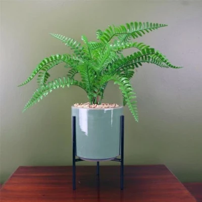 40cm artificial fern plant with ceramic planter and stand. Fern plant with plastic leaves in a decorative ceramic planter with metal stand The stems are wired and the leaves can be shaped to fit your space. As we have the plant arranged in our photos it measures 40cm x 35cm x 35cm The decorative ceramic green planter measures 11cm (h) x 12cm (w). Overall the stand is 17cm heigh but adds 7cm of height to the planter as it sits inside it The leaves are plastic. The plastic decorative planter is topped with fixed pebbles for an attractive- low maintenance finish Genuine Leaf Design UK Product