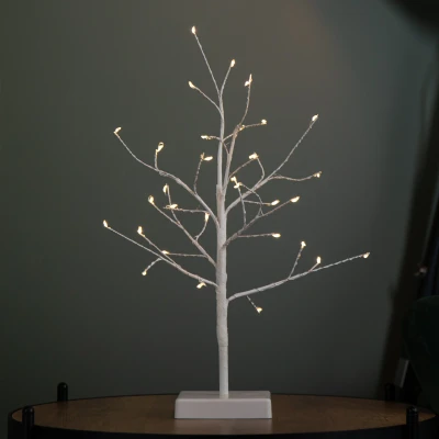 Cheaper-OnlineBring a touch of enchanting elegance to your home this festive season with this 40cm Light up Micro LED Twig Tree. Whether you're creating a magical Christmas display or adding a subtle glow to your winter decor, this micro light twig tree brings charm and versatility to any room.. This beautifully crafted decorative piece features a sleek white twig design set on a matching white base, creating a modern, minimalist look that complements any dazzling display. Delicately woven around each branch are 32 micro LED lights with a warm white to multi-colour switch function, allowing you to effortlessly change the ambiance from a soft, cosy glow to a vibrant, cheerful display with just the flick of the black on/off switch. Powered by 3 x AA batteries (not included), it offers flexible placement without the need for mains power.. Suitable for indoor use only.. Product Specifications. 32 Multi-Coloured or Warm White LEDs. Height: 40cm Length: 28cm Width: 25cm. Requires 3 x AA Batteries