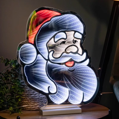 ManoManoGeneral description Transform your holiday decor with this stunning Santa's head infinity LED light decoration. Featuring an infinity mirror with red and white LEDs, it creates a never-ending reflection of Santa when lit up. This simple yet mesmerizing light display is thin while creating an amazing 3D effect as you view it from different angles, making it a perfect festive display and a talking point for family and guests. Technical specifications Height: 40 cm Length: 33 cm Stand dimensions: 15 cm x 7 cm Cable length: 3 m Installation Quick and easy to set up: peel the film off the mirror, attach the base, and plug in. Usage Suitable for indoor use only (transformer plug must remain indoors). Can be placed on most flat surfaces such as a mantlepiece, windowsill, or by the front door to welcome visitors.