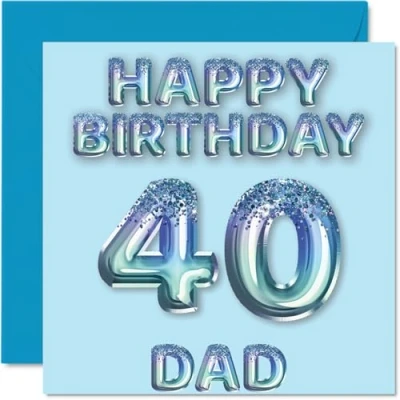 MAKE YOUR DAD SMILE WITH THIS AWESOME BIRTHDAY CARD: This exceptional quality birthday card for him shows the design of blue glitter balloons stating 'Happy Birthday 40' Dad'. If you are looking for funny birthday cards for men, then then this happy birthday card is bound to make them laugh. Not just for friendship gifts for men this could also be for Dad, Step Dad or Father in Law. WHAT DO YOU GET: The card is printed on one side and BLANK ON THE INSIDE to allow you to write your very own message. The unique fun design is printed on a specially sourced and environmentally responsible board. At 360 microns thick the natural white one-sided gloss board has a quality look and feel. Supplied with a coloured gummed envelope to complement the design and ready to be sealed and sent in the post. Birthday card for Dad, 40th birthday card for him. NO INK SMUDGES: There is nothing worse than writing inside a card to find that the shiny surface makes the ink smudge. This is why we use a high quality one sided coated board. The uncoated side will absorb more of the ink from your pen to make smudging a thing of the past. Dad birthday cards, birthday card cute, 40th birthday gifts for Dad, Dad birthday cards. SIZES: Greeting Card = 145mm x 145mm, Envelope = 155mm x 155mm, Card Thickness = 360 micron. Great Dad birthday cards from Daughter and Son, male birthday card, 40th birthday card, happy birthday Dad cards, family birthday card. MADE AND QUALITY CHECKED IN THE UK: We print and manufacture all our product right her in the UK so you can be sure of a fast turnaround and a product that is expertly made. Using environmentally responsible premium board our card is conscious of the responsible management of the world's forests.