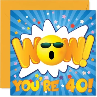 MAKE THEM SMILE WITH THIS UNIQUE BIRTHDAY CARD: This exceptional quality birthday card for him or her shows the design 'WOW Youre 40'. If you are looking for special birthday greetings cards for Men birthday card then then this happy birthday card is bound to make them smile. Not just for birthday gifts for Men this could also be for Uncle, Son, Auntie, Neighbour, Friend, Nephew, Brother or Husband. WHAT DO YOU GET: The cards are printed on both sides with the inside print saying '0' and ample space for your own personal message. The unique fun design is printed on a specially sourced and environmentally responsible board. At 360 microns thick the natural white one-sided gloss board has a quality look and feel. Supplied with a coloured gummed envelope to complement the design and ready to be sealed and sent in the post. NO INK SMUDGES: There is nothing worse than writing inside a card to find that the shiny surface makes the ink smudge. This is why we use a high quality one sided coated board. The uncoated side will absorb more of the ink from your pen to make smudging a thing of the past. 40th Birthday card for Auntie, 40th Birthday card for Neighbour, 40th Birthday card for Friend. SIZES: Greeting Card = 145mm x 145mm, Envelope = 155mm x 155mm, Card Thickness = 360 micron. Nephew 40th birthday card, birthday cards for Brother, special birthday cards for Husband, 40th birthday card Uncle, Son 40th birthday card. MADE AND QUALITY CHECKED IN THE UK: We print and manufacture all our products right here in the UK so you can be sure of a fast turnaround and a product that is expertly made. Using environmentally responsible premium board our card is conscious of the responsible management of the world's forests - perfect birthday cards for Men, fun birthday cards for him, Son 40th birthday cards, female birthday cards.