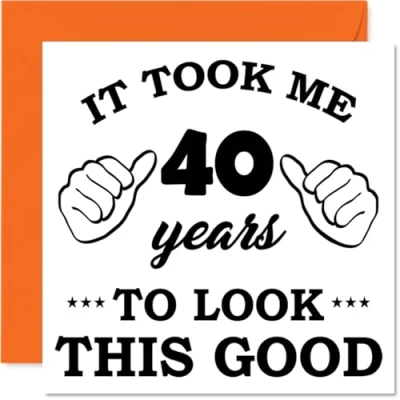 MAKE THEM SMILE WITH THIS UNIQUE BIRTHDAY CARD: This exceptional quality birthday card for him or her shows the design 'It Took Me 40 Years To Look This Good'. If you are looking for special birthday greetings cards for Men birthday card then then this happy birthday card is bound to make them smile. Not just for birthday gifts for Men this could also be for Niece, Auntie, Friend, Colleague, Sister, Uncle, Cousin or Brother. WHAT DO YOU GET: The cards are printed on both sides with the inside print saying '0' and ample space for your own personal message. The unique fun design is printed on a specially sourced and environmentally responsible board. At 360 microns thick the natural white one-sided gloss board has a quality look and feel. Supplied with a coloured gummed envelope to complement the design and ready to be sealed and sent in the post. NO INK SMUDGES: There is nothing worse than writing inside a card to find that the shiny surface makes the ink smudge. This is why we use a high quality one sided coated board. The uncoated side will absorb more of the ink from your pen to make smudging a thing of the past. 40th Birthday card for Friend, 40th Birthday card for Colleague, 40th Birthday card for Sister. SIZES: Greeting Card = 145mm x 145mm, Envelope = 155mm x 155mm, Card Thickness = 360 micron. Uncle 40th birthday card, birthday cards for Cousin, special birthday cards for Brother, 40th birthday card Niece, Auntie 40th birthday card. MADE AND QUALITY CHECKED IN THE UK: We print and manufacture all our products right here in the UK so you can be sure of a fast turnaround and a product that is expertly made. Using environmentally responsible premium board our card is conscious of the responsible management of the world's forests - perfect birthday cards for Men, fun birthday cards for him, Auntie 40th birthday cards, female birthday cards.