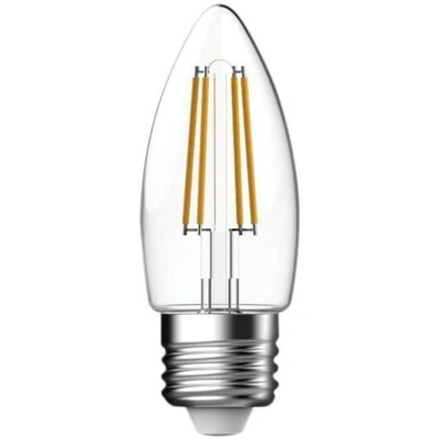 General description This LED candle bulb features a decorative filament design that mimics traditional halogen bulbs, making it ideal for decorative fixtures. It provides a warm white light with a color temperature of 2,700K, creating a cozy ambiance. The bulb offers instant, flicker-free illumination and has an average lifespan of 15,000 hours. It is a true retrofit for standard E27 fittings, combining classic appearance with energy efficiency. Technical specifications Fitting: E27 (ES) Wattage: 4W (equivalent to 40W halogen) Light output: 470 lumens Color temperature: 2,700K (Warm White) Switching cycles: 40,000 Rated lifespan: 15,000 hours Dimensions: 35 x 98 mm Dimmable: No Rated: A+ Compatibility and accessories Compatible with standard E27 light fixtures Installation Simply screw the bulb into compatible E27 sockets for immediate use. Usage Ideal for decorative lighting in homes, restaurants, and other settings where a warm, inviting glow is desired. Other information