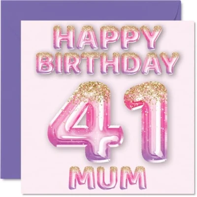 41st Birthday Card for Mum Pink & Purple Glitter Balloons Happy Cards 41 Year Old Mother from Son Daughter, 145mm x Bday Greeting Gift