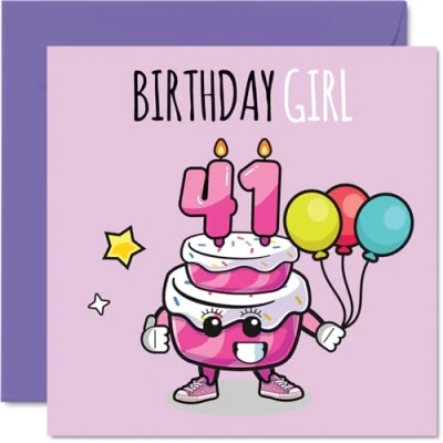 MAKE HER SMILE WITH THIS UNIQUE BIRTHDAY CARD: This exceptional quality birthday card for her shows the design 'Birthday Girl 41'. If you are looking for special birthday greetings cards for Women birthday card then then this happy birthday card is bound to make her smile. Not just for birthday gifts for Women this could also be for Sister, Wife, Neighbour, Cousin, Auntie, Colleague, Friend or Daughter. WHAT DO YOU GET: The card is printed on one side and BLANK ON THE INSIDE to allow you to write your very own message. The unique fun design is printed on a specially sourced and environmentally responsible board. At 360 microns thick the natural white one-sided gloss board has a quality look and feel. Supplied with a coloured gummed envelope to complement the design and ready to be sealed and sent in the post. Great Sister birthday cards, 41st birthday card, Wife birthday card. NO INK SMUDGES: There is nothing worse than writing inside a card to find that the shiny surface makes the ink smudge. This is why we use a high quality one sided coated board. The uncoated side will absorb more of the ink from your pen to make smudging a thing of the past. 41st Birthday card for Neighbour, 41st Birthday card for Cousin, 41st Birthday card for Auntie. SIZES: Greeting Card = 145mm x 145mm, Envelope = 155mm x 155mm, Card Thickness = 360 micron. Colleague 41st birthday card, birthday cards for Friend, cute birthday cards for Daughter, 41st birthday card Sister, Wife 41st birthday card. MADE AND QUALITY CHECKED IN THE UK: We print and manufacture all our products right here in the UK so you can be sure of a fast turnaround and a product that is expertly made. Using environmentally responsible premium board our card is conscious of the responsible management of the world's forests - perfect birthday cards for Women, fun birthday cards for her, Wife 41st birthday cards, female birthday cards.