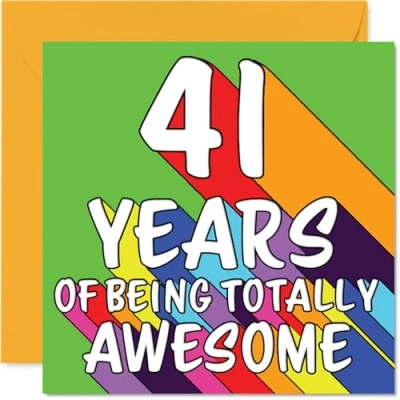 MAKE THEM SMILE WITH THIS UNIQUE BIRTHDAY CARD: This exceptional quality birthday card for him or her shows the design '41 YEARS OF BEING TOTALLY AWESOME'. If you are looking for special birthday greetings cards for Men birthday card then then this happy birthday card is bound to make them smile. Not just for birthday gifts for Men this could also be for Son, Auntie, Neighbour, Friend, Nephew, Brother, Husband or Colleague. WHAT DO YOU GET: The card is printed on one side and BLANK ON THE INSIDE to allow you to write your very own message. The unique fun design is printed on a specially sourced and environmentally responsible board. At 360 microns thick the natural white one-sided gloss board has a quality look and feel. Supplied with a coloured gummed envelope to complement the design and ready to be sealed and sent in the post. Great Son birthday cards, Auntie birthday card. DESIGNED FOR WRITING: There is nothing worse than writing inside a card to find that the shiny surface makes the ink smudge. This is why we use a high quality one sided coated board. The uncoated side will absorb more of the ink from your pen to make smudging a thing of the past. 41st Birthday card for Neighbour, 41st Birthday card for Friend, 41st Birthday card for Nephew. SIZES: Greeting Card = 145mm x 145mm, Envelope = 155mm x 155mm, Card Thickness = 360 micron. Brother 41st birthday card, birthday cards for Husband, special birthday cards for Colleague, 41st birthday card Son, Auntie 41st birthday card. MADE AND QUALITY CHECKED IN THE UK: We print and manufacture all our products right here in the UK so you can be sure of a fast turnaround and a product that is expertly made. Using environmentally responsible premium board our card is conscious of the responsible management of the world's forests - perfect birthday cards for Men, fun birthday cards for him, Auntie 41st birthday cards, female birthday cards.