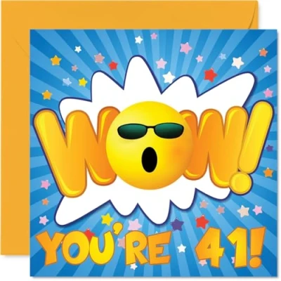 MAKE THEM SMILE WITH THIS UNIQUE BIRTHDAY CARD: This exceptional quality birthday card for him or her shows the design 'WOW Youre 41'. If you are looking for special birthday greetings cards for Men birthday card then then this happy birthday card is bound to make them smile. Not just for birthday gifts for Men this could also be for Son, Auntie, Neighbour, Friend, Nephew, Brother, Husband or Colleague. WHAT DO YOU GET: The cards are printed on both sides with the inside print saying '0' and ample space for your own personal message. The unique fun design is printed on a specially sourced and environmentally responsible board. At 360 microns thick the natural white one-sided gloss board has a quality look and feel. Supplied with a coloured gummed envelope to complement the design and ready to be sealed and sent in the post. NO INK SMUDGES: There is nothing worse than writing inside a card to find that the shiny surface makes the ink smudge. This is why we use a high quality one sided coated board. The uncoated side will absorb more of the ink from your pen to make smudging a thing of the past. 41st Birthday card for Neighbour, 41st Birthday card for Friend, 41st Birthday card for Nephew. SIZES: Greeting Card = 145mm x 145mm, Envelope = 155mm x 155mm, Card Thickness = 360 micron. Brother 41st birthday card, birthday cards for Husband, special birthday cards for Colleague, 41st birthday card Son, Auntie 41st birthday card. MADE AND QUALITY CHECKED IN THE UK: We print and manufacture all our products right here in the UK so you can be sure of a fast turnaround and a product that is expertly made. Using environmentally responsible premium board our card is conscious of the responsible management of the world's forests - perfect birthday cards for Men, fun birthday cards for him, Auntie 41st birthday cards, female birthday cards.