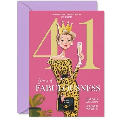 MAKE HER SMILE WITH THIS UNIQUE BIRTHDAY CARD: This exceptional quality birthday card for her shows the design 'Wishing you all the best as you celebrate 41 years of fabulousness'. If you are looking for special birthday greetings cards for Women birthday card then then this happy birthday card is bound to make her smile. Not just for birthday gifts for Women this could also be for Sister, Colleague, Auntie, Friend, Cousin, Niece, Daughter or Wife. WHAT DO YOU GET: The cards are printed on both sides with the inside print saying 'Have a Luminously Lovely Day' and ample space for your own personal message. The unique design is printed on a specially sourced and environmentally responsible board. At 360 microns thick the natural white one-sided gloss board has a quality look and feel. Supplied with a coloured gummed envelope to complement the design and ready to be sealed and sent in the post. NO INK SMUDGES: There is nothing worse than writing inside a card to find that the shiny surface makes the ink smudge. This is why we use a high quality one sided coated board. The uncoated side will absorb more of the ink from your pen to make smudging a thing of the past. 41st Birthday card for Auntie, 41st Birthday card for Friend, 41st Birthday card for Cousin. SIZES: Greeting Card = 127mm x 178mm, Envelope = 130mm x 180mm, Card Thickness = 360 micron. Niece 41st birthday card, birthday cards for Daughter, cute birthday cards for Wife, 41st birthday card Sister, Colleague 41st birthday card. MADE AND QUALITY CHECKED IN THE UK: We print and manufacture all our products right here in the UK so you can be sure of a fast turnaround and a product that is expertly made. Using environmentally responsible premium board our card is conscious of the responsible management of the world's forests - perfect birthday cards for Women, fun birthday cards for her, Colleague 41st birthday cards, female birthday cards.