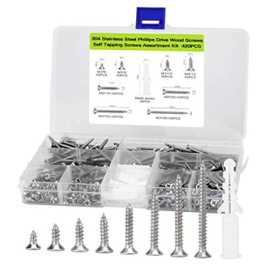 420pcs M3 Flat Head Self Tapping Screws Assortment Kit,304 Stainless Steel Wood Screw Phillips Head,Contains 20pcs M6 Anchors