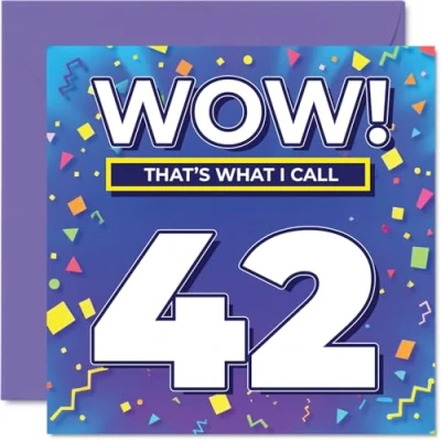 MAKE THEM SMILE WITH THIS UNIQUE BIRTHDAY CARD: This exceptional quality birthday card for him or her shows the design 'Wow! That?s What I Call 42'. If you are looking for special birthday greetings cards for Men birthday card then then this happy birthday card is bound to make them smile. Not just for birthday gifts for Men this could also be for Auntie, Neighbour, Friend, Nephew, Brother, Husband, Colleague or Dad. WHAT DO YOU GET: The card is printed on one side and BLANK ON THE INSIDE to allow you to write your very own message. The unique fun design is printed on a specially sourced and environmentally responsible board. At 360 microns thick the natural white one-sided gloss board has a quality look and feel. Supplied with a coloured gummed envelope to complement the design and ready to be sealed and sent in the post. Great Auntie birthday cards, Neighbour birthday card. DESIGNED FOR WRITING: There is nothing worse than writing inside a card to find that the shiny surface makes the ink smudge. This is why we use a high quality one sided coated board. The uncoated side will absorb more of the ink from your pen to make smudging a thing of the past. 42nd Birthday card for Friend, 42nd Birthday card for Nephew, 42nd Birthday card for Brother. SIZES: Greeting Card = 145mm x 145mm, Envelope = 155mm x 155mm, Card Thickness = 360 micron. Husband 42nd birthday card, birthday cards for Colleague, special birthday cards for Dad, 42nd birthday card Auntie, Neighbour 42nd birthday card. MADE AND QUALITY CHECKED IN THE UK: We print and manufacture all our products right here in the UK so you can be sure of a fast turnaround and a product that is expertly made. Using environmentally responsible premium board our card is conscious of the responsible management of the world's forests - perfect birthday cards for Men, fun birthday cards for him, Neighbour 42nd birthday cards, female birthday cards.