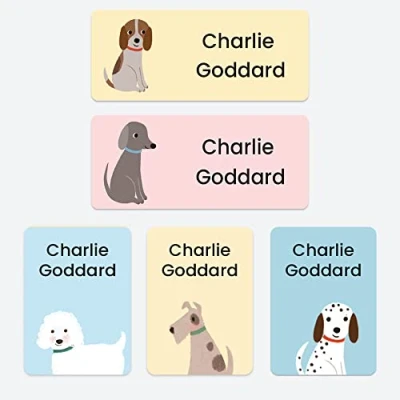43 x Mixed Pack No Iron Personalised Stick On Waterproof Washable Name Labels Clothes, School Uniform, Equipment, Shoes and More. School, Nursery, Day Care, Hospital Cute Dogs