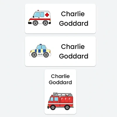43 x Mixed Pack No Iron Personalised Stick On Waterproof Washable Name Labels Clothes, School Uniform, Equipment, Shoes and More. School, Nursery, Day Care, Hospital Emergency Vehicles