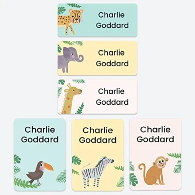 43 x No Iron Personalised Stick On Waterproof Washable Name Labels Great for Clothes, School Uniform, Equipment, Shoes. School, Nursery, Day Care, Hospital Jungle Animals