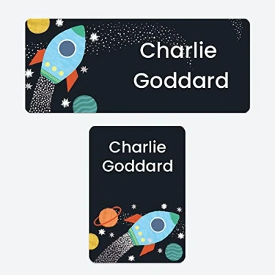 43 x No Iron Personalised Stick On Waterproof Washable Name Labels Great for Clothes, School Uniform, Equipment, Shoes. School, Nursery, Day Care, Hospital Outer Space