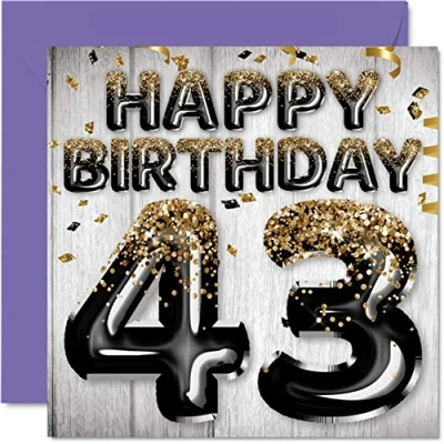 MAKE THEM SMILE WITH THIS AWESOME BIRTHDAY CARD: This exceptional quality birthday card for Him shows the design of black & gold glitter balloons stating 'Happy Birthday 43'. If you are looking for funny birthday cards for Men, then then this happy birthday card is bound to make them laugh. Not just for friendship gifts for Men this could also be for Best Friend, Work Colleague, Dad, Grandpa, Nan, Dad, Grandad, Grandad, Colleague, Brother, Brother, Cousin, Uncle or Uncle. WHAT DO YOU GET: The card is printed on one side and BLANK ON THE INSIDE to allow you to write your very own message. The unique fun design is printed on a specially sourced and environmentally responsible board. At 360 microns thick the natural white one-sided gloss board has a quality look and feel. Supplied with a coloured gummed envelope to complement the design and ready to be sealed and sent in the post. Birthday card for Dad, 43rd birthday card for Him. NO INK SMUDGES: There is nothing worse than writing inside a card to find that the shiny surface makes the ink smudge. This is why we use a high quality one sided coated board. The uncoated side will absorb more of the ink from your pen to make smudging a thing of the past. Big Brother birthday cards, Man's birthday card, birthday card cute, 43rd birthday gifts for Men, 43rd birthday gifts for Dad, Cousin birthday cards. SIZES: Greeting Card = 145mm x 145mm, Envelope = 155mm x 155mm, Card Thickness = 360 micron. Great Dad birthday cards from Son or Son, male birthday card, 43rd birthday card, happy birthday Friend cards, Friends 43rd birthday cards, Cousin birthday card. MADE AND QUALITY CHECKED IN THE UK: We print and manufacture all our product right Him in the UK so you can be sure of a fast turnaround and a product that is expertly made. Using environmentally responsible premium board our card is conscious of the responsible management of the world's forests - Big Brother 43rd birthday cards, Friends 43rd birthday cards, happy male birthday cards.