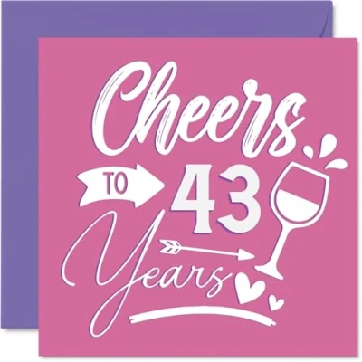MAKE HER SMILE WITH THIS UNIQUE BIRTHDAY CARD: This exceptional quality birthday card for her shows the design 'Cheers to 43 Years'. If you are looking for special birthday greetings cards for Women birthday card then then this happy birthday card is bound to make her smile. Not just for birthday gifts for Women this could also be for Daughter, Friend, Niece, Auntie, Neighbour, Cousin, Colleague or Sister. WHAT DO YOU GET: The card is printed on one side and BLANK ON THE INSIDE to allow you to write your very own message. The unique fun design is printed on a specially sourced and environmentally responsible board. At 360 microns thick the natural white one-sided gloss board has a quality look and feel. Supplied with a coloured gummed envelope to complement the design and ready to be sealed and sent in the post. Great Daughter birthday cards, 43rd birthday card, Friend birthday card. NO INK SMUDGES: There is nothing worse than writing inside a card to find that the shiny surface makes the ink smudge. This is why we use a high quality one sided coated board. The uncoated side will absorb more of the ink from your pen to make smudging a thing of the past. 43rd Birthday card for Niece, 43rd Birthday card for Auntie, 43rd Birthday card for Neighbour. SIZES: Greeting Card = 145mm x 145mm, Envelope = 155mm x 155mm, Card Thickness = 360 micron. Cousin 43rd birthday card, birthday cards for Colleague, cute birthday cards for Sister, 43rd birthday card Daughter, Friend 43rd birthday card. MADE AND QUALITY CHECKED IN THE UK: We print and manufacture all our products right here in the UK so you can be sure of a fast turnaround and a product that is expertly made. Using environmentally responsible premium board our card is conscious of the responsible management of the world's forests - perfect birthday cards for Women, fun birthday cards for her, Friend 43rd birthday cards, female birthday cards.