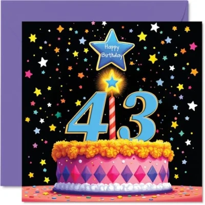 43rd Birthday Cards for Women Men Pink Cake & Stars Happy Card 43 Year Old Woman Man Uncle Nephew Neighbour Auntie, 145mm Bday Greeting