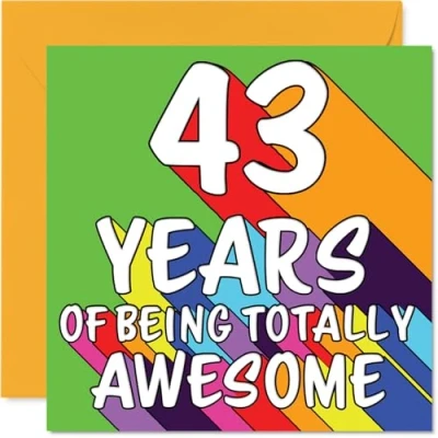 MAKE THEM SMILE WITH THIS UNIQUE BIRTHDAY CARD: This exceptional quality birthday card for him or her shows the design '43 YEARS OF BEING TOTALLY AWESOME'. If you are looking for special birthday greetings cards for Men birthday card then then this happy birthday card is bound to make them smile. Not just for birthday gifts for Men this could also be for Neighbour, Friend, Nephew, Brother, Husband, Colleague, Dad or Cousin. WHAT DO YOU GET: The card is printed on one side and BLANK ON THE INSIDE to allow you to write your very own message. The unique fun design is printed on a specially sourced and environmentally responsible board. At 360 microns thick the natural white one-sided gloss board has a quality look and feel. Supplied with a coloured gummed envelope to complement the design and ready to be sealed and sent in the post. Great Neighbour birthday cards, Friend birthday card. DESIGNED FOR WRITING: There is nothing worse than writing inside a card to find that the shiny surface makes the ink smudge. This is why we use a high quality one sided coated board. The uncoated side will absorb more of the ink from your pen to make smudging a thing of the past. 43rd Birthday card for Nephew, 43rd Birthday card for Brother, 43rd Birthday card for Husband. SIZES: Greeting Card = 145mm x 145mm, Envelope = 155mm x 155mm, Card Thickness = 360 micron. Colleague 43rd birthday card, birthday cards for Dad, special birthday cards for Cousin, 43rd birthday card Neighbour, Friend 43rd birthday card. MADE AND QUALITY CHECKED IN THE UK: We print and manufacture all our products right here in the UK so you can be sure of a fast turnaround and a product that is expertly made. Using environmentally responsible premium board our card is conscious of the responsible management of the world's forests - perfect birthday cards for Men, fun birthday cards for him, Friend 43rd birthday cards, female birthday cards.