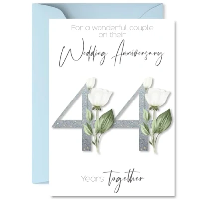 MAKE THEM SMILE WITH THIS ROMANTIC ANNIVERSARY CARD: This exceptional quality anniversary card for her or him shows the design 'For a Wonderful couple on their Wedding Anniversary 44 Years Together'. If you are looking for special anniversary greetings cards for Women anniversary card then then this happy anniversary card is bound to make them smile. Not just for anniversary gifts for Men this could also be for Girlfriend, Partner, Wife, Husband, Companion or Boyfriend. WHAT DO YOU GET: The cards are printed on both sides with the inside print saying 'Have a Lovely Day' and ample space for your own personal message. The unique fun design is printed on a specially sourced and environmentally responsible board. At 360 microns thick the natural white one-sided gloss board has a quality look and feel. Supplied with a coloured gummed envelope to complement the design and ready to be sealed and sent in the post. NO INK SMUDGES: There is nothing worse than writing inside a card to find that the shiny surface makes the ink smudge. This is why we use a high quality one sided coated board. The uncoated side will absorb more of the ink from your pen to make smudging a thing of the past. 44th anniversary card for Wife, 44th anniversary card for Husband, 44th anniversary card for Companion. SIZES: Greeting Card = 148mm x 210mm, Envelope = 150mm x 212mm, Card Thickness = 360 micron. Companion 44th anniversary card, anniversary cards for Wife, cute anniversary cards for Husband, 44th anniversary card Girlfriend, Partner 44th anniversary card. MADE AND QUALITY CHECKED IN THE UK: We print and manufacture all our products right here in the UK so you can be sure of a fast turnaround and a product that is expertly made. Using environmentally responsible premium board our card is conscious of the responsible management of the world's forests - perfect anniversary cards for Men, cute anniversary cards for her, Partner 44th anniversary cards, female anniversary cards.