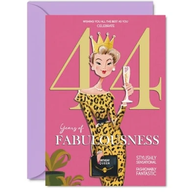 MAKE HER SMILE WITH THIS UNIQUE BIRTHDAY CARD: This exceptional quality birthday card for her shows the design 'Wishing you all the best as you celebrate 44 years of fabulousness'. If you are looking for special birthday greetings cards for Women birthday card then then this happy birthday card is bound to make her smile. Not just for birthday gifts for Women this could also be for Auntie, Cousin, Daughter, Niece, Sister, Friend, Colleague or Neighbour. WHAT DO YOU GET: The cards are printed on both sides with the inside print saying 'Have a Luminously Lovely Day' and ample space for your own personal message. The unique design is printed on a specially sourced and environmentally responsible board. At 360 microns thick the natural white one-sided gloss board has a quality look and feel. Supplied with a coloured gummed envelope to complement the design and ready to be sealed and sent in the post. NO INK SMUDGES: There is nothing worse than writing inside a card to find that the shiny surface makes the ink smudge. This is why we use a high quality one sided coated board. The uncoated side will absorb more of the ink from your pen to make smudging a thing of the past. 44th Birthday card for Daughter, 44th Birthday card for Niece, 44th Birthday card for Sister. SIZES: Greeting Card = 148mm x 210mm, Envelope = 150mm x 212mm, Card Thickness = 360 micron. Friend 44th birthday card, birthday cards for Colleague, cute birthday cards for Neighbour, 44th birthday card Auntie, Cousin 44th birthday card. MADE AND QUALITY CHECKED IN THE UK: We print and manufacture all our products right here in the UK so you can be sure of a fast turnaround and a product that is expertly made. Using environmentally responsible premium board our card is conscious of the responsible management of the world's forests - perfect birthday cards for Women, fun birthday cards for her, Cousin 44th birthday cards, female birthday cards.