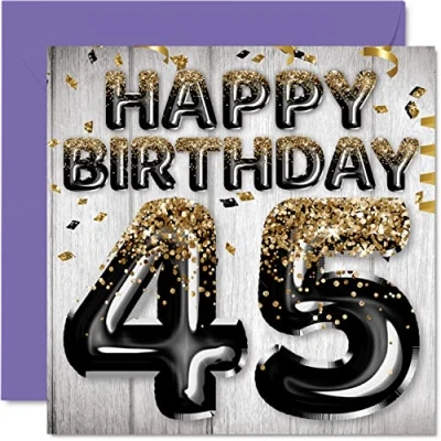 MAKE THEM SMILE WITH THIS AWESOME BIRTHDAY CARD: This exceptional quality birthday card for Him shows the design of black & gold glitter balloons stating 'Happy Birthday 45'. If you are looking for funny birthday cards for Men, then then this happy birthday card is bound to make them laugh. Not just for friendship gifts for Men this could also be for Best Friend, Work Colleague, Dad, Grandpa, Nan, Dad, Grandad, Grandad, Colleague, Brother, Brother, Cousin, Uncle or Uncle. WHAT DO YOU GET: The card is printed on one side and BLANK ON THE INSIDE to allow you to write your very own message. The unique fun design is printed on a specially sourced and environmentally responsible board. At 360 microns thick the natural white one-sided gloss board has a quality look and feel. Supplied with a coloured gummed envelope to complement the design and ready to be sealed and sent in the post. Birthday card for Dad, 45th birthday card for Him. NO INK SMUDGES: There is nothing worse than writing inside a card to find that the shiny surface makes the ink smudge. This is why we use a high quality one sided coated board. The uncoated side will absorb more of the ink from your pen to make smudging a thing of the past. Big Brother birthday cards, Man's birthday card, birthday card cute, 45th birthday gifts for Men, 45th birthday gifts for Dad, Cousin birthday cards. SIZES: Greeting Card = 145mm x 145mm, Envelope = 155mm x 155mm, Card Thickness = 360 micron. Great Dad birthday cards from Son or Son, male birthday card, 45th birthday card, happy birthday Friend cards, Friends 45th birthday cards, Cousin birthday card. MADE AND QUALITY CHECKED IN THE UK: We print and manufacture all our product right Him in the UK so you can be sure of a fast turnaround and a product that is expertly made. Using environmentally responsible premium board our card is conscious of the responsible management of the world's forests - Big Brother 45th birthday cards, Friends 45th birthday cards, happy male birthday cards.