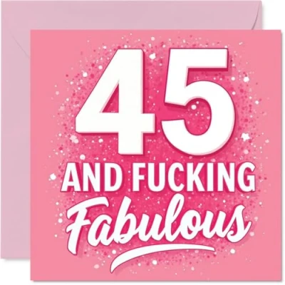 MAKE HER SMILE WITH THIS UNIQUE BIRTHDAY CARD: This exceptional quality birthday card for her shows the design '45 AND FUCKING FABULOUS'. If you are looking for special birthday greetings cards for Women birthday card then then this happy birthday card is bound to make her smile. Not just for birthday gifts for Women this could also be for Niece, Auntie, Neighbour, Cousin, Colleague, Sister, Wife or Daughter. WHAT DO YOU GET: The card is printed on one side and BLANK ON THE INSIDE to allow you to write your very own message. The unique fun design is printed on a specially sourced and environmentally responsible board. At 360 microns thick the natural white one-sided gloss board has a quality look and feel. Supplied with a coloured gummed envelope to complement the design and ready to be sealed and sent in the post. Great Niece birthday cards, 45th birthday card, Auntie birthday card. NO INK SMUDGES: There is nothing worse than writing inside a card to find that the shiny surface makes the ink smudge. This is why we use a high quality one sided coated board. The uncoated side will absorb more of the ink from your pen to make smudging a thing of the past. 45th Birthday card for Neighbour, 45th Birthday card for Cousin, 45th Birthday card for Colleague. SIZES: Greeting Card = 145mm x 145mm, Envelope = 155mm x 155mm, Card Thickness = 360 micron. Sister 45th birthday card, birthday cards for Wife, cute birthday cards for Daughter, 45th birthday card Niece, Auntie 45th birthday card. MADE AND QUALITY CHECKED IN THE UK: We print and manufacture all our products right here in the UK so you can be sure of a fast turnaround and a product that is expertly made. Using environmentally responsible premium board our card is conscious of the responsible management of the world's forests - perfect birthday cards for Women, fun birthday cards for her, Auntie 45th birthday cards, female birthday cards.
