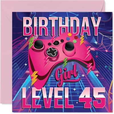 45th Birthday Cards for Women Gamer Level Happy Card 45 Year Old Woman Neighbour Cousin Auntie Niece, 145mm Bday Greeting