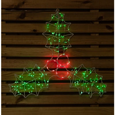 ManoManoGeneral description This light up Holly with Berries Christmas silhouette is a stunning decoration that will enhance your Christmas decor. Perfect for hanging above the fireplace, along garden fences, or creating a dazzling window display, it brings the magical feeling of Christmas to your home. Technical specifications Height: 43 cm Length: 46 cm Illumination: 170 red and green LED lights Power source: Mains powered Cable length: 5 meters (clear) Compatibility and accessories Suitable for indoor and outdoor use (transformer plug must remain dry) Other information White metal frame with pin wire LEDs woven around Includes a white metal hanging hoop for easy placement