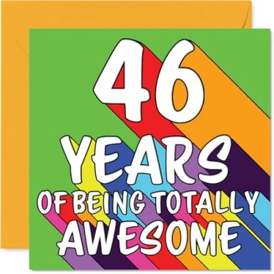 MAKE THEM SMILE WITH THIS UNIQUE BIRTHDAY CARD: This exceptional quality birthday card for him or her shows the design '46 YEARS OF BEING TOTALLY AWESOME'. If you are looking for special birthday greetings cards for Men birthday card then then this happy birthday card is bound to make them smile. Not just for birthday gifts for Men this could also be for Brother, Husband, Colleague, Dad, Cousin, Sister, Wife or Niece. WHAT DO YOU GET: The card is printed on one side and BLANK ON THE INSIDE to allow you to write your very own message. The unique fun design is printed on a specially sourced and environmentally responsible board. At 360 microns thick the natural white one-sided gloss board has a quality look and feel. Supplied with a coloured gummed envelope to complement the design and ready to be sealed and sent in the post. Great Brother birthday cards, Husband birthday card. DESIGNED FOR WRITING: There is nothing worse than writing inside a card to find that the shiny surface makes the ink smudge. This is why we use a high quality one sided coated board. The uncoated side will absorb more of the ink from your pen to make smudging a thing of the past. 46th Birthday card for Colleague, 46th Birthday card for Dad, 46th Birthday card for Cousin. SIZES: Greeting Card = 145mm x 145mm, Envelope = 155mm x 155mm, Card Thickness = 360 micron. Sister 46th birthday card, birthday cards for Wife, special birthday cards for Niece, 46th birthday card Brother, Husband 46th birthday card. MADE AND QUALITY CHECKED IN THE UK: We print and manufacture all our products right here in the UK so you can be sure of a fast turnaround and a product that is expertly made. Using environmentally responsible premium board our card is conscious of the responsible management of the world's forests - perfect birthday cards for Men, fun birthday cards for him, Husband 46th birthday cards, female birthday cards.
