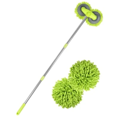 DOUBLE-HEAD ROTATING DESIGN:The car washing brush adopts a new double brush head combination design. The brush head can rotate 360° and fold freely at different angles, doubling the cleaning effect and making your cleaning easier BUILT-IN SPRING DESIGN: Different angles can be adjusted freely, the brush head fits the car surface better, and is more suitable for cleaning irregular surfaces. The car wash mop has an adjustable long handle, which can be easily adjusted to any length, effectively cleaning corners and saving a lot of cleaning time SOFT MICROFIBER: This car wash brush head is designed with double-ended chenille microfiber, which is soft and absorbent, easy to foam, scratch-free, easily removes dust and stubborn dirt without damaging the car paint WIDE RANGE OF USE: Suitable for Solar panels,RV, Truck, SUV, Caravan and Home cleaning. can be for washing wheels, roof, interior , can also for window, floor , providing convenience and excellent cleaning performance STURDY STAINLESS STEEL POLE: High-quality stainless steel long handle design, each thickened brush pole is beautifully made and painted, sturdy and thickened, rust-proof and not easy to break, with stronger load-bearing capacity. The non-slip grip design ensures that you will not slip while cleaning