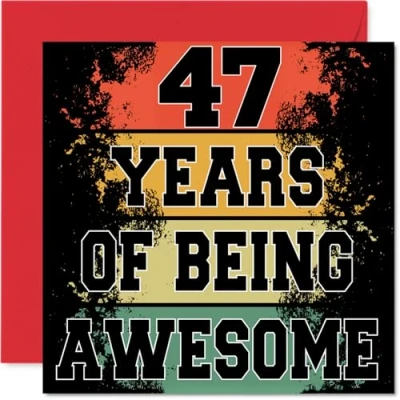 MAKE THEM SMILE WITH THIS UNIQUE BIRTHDAY CARD: This exceptional quality birthday card for him or her shows the design '47 Years Of Being Awesome'. If you are looking for special birthday greetings cards for Men birthday card then then this happy birthday card is bound to make them smile. Not just for birthday gifts for Men this could also be for Husband, Colleague, Dad, Cousin, Sister, Wife, Niece or Daughter. WHAT DO YOU GET: The card is printed on one side and BLANK ON THE INSIDE to allow you to write your very own message. The unique fun design is printed on a specially sourced and environmentally responsible board. At 360 microns thick the natural white one-sided gloss board has a quality look and feel. Supplied with a coloured gummed envelope to complement the design and ready to be sealed and sent in the post. Great Husband birthday cards, Colleague birthday card. NO INK SMUDGES: There is nothing worse than writing inside a card to find that the shiny surface makes the ink smudge. This is why we use a high quality one sided coated board. The uncoated side will absorb more of the ink from your pen to make smudging a thing of the past. 47th Birthday card for Dad, 47th Birthday card for Cousin, 47th Birthday card for Sister. SIZES: Greeting Card = 145mm x 145mm, Envelope = 155mm x 155mm, Card Thickness = 360 micron. Wife 47th birthday card, birthday cards for Niece, special birthday cards for Daughter, 47th birthday card Husband, Colleague 47th birthday card. MADE AND QUALITY CHECKED IN THE UK: We print and manufacture all our products right here in the UK so you can be sure of a fast turnaround and a product that is expertly made. Using environmentally responsible premium board our card is conscious of the responsible management of the world's forests - perfect birthday cards for Men, fun birthday cards for him, Colleague 47th birthday cards, female birthday cards.