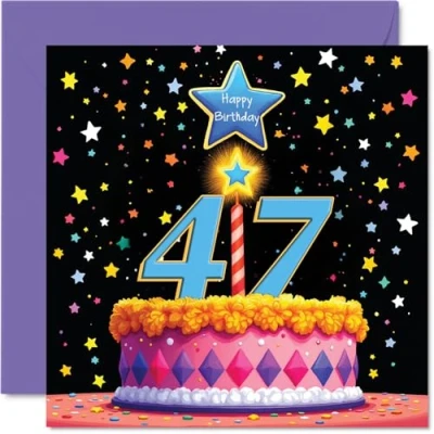 47th Birthday Cards for Women Men Pink Cake & Stars Happy Card 47 Year Old Woman Man Husband Dad Brother Colleague, 145mm Bday Greeting