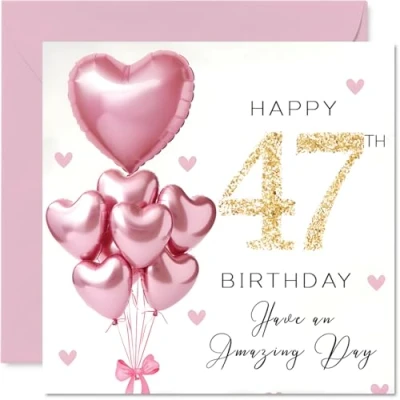 47th Birthday Cards for Women Pink Glitter Balloons Happy Card 47 Year Old Woman Sister Auntie Friend Colleague, 145mm Bday Greeting