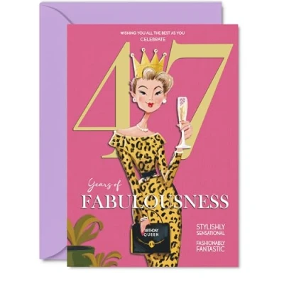 MAKE HER SMILE WITH THIS UNIQUE BIRTHDAY CARD: This exceptional quality birthday card for her shows the design 'Wishing you all the best as you celebrate 47 years of fabulousness'. If you are looking for special birthday greetings cards for Women birthday card then then this happy birthday card is bound to make her smile. Not just for birthday gifts for Women this could also be for Daughter, Wife, Neighbour, Sister, Colleague, Auntie, Friend or Cousin. WHAT DO YOU GET: The cards are printed on both sides with the inside print saying 'Have a Luminously Lovely Day' and ample space for your own personal message. The unique design is printed on a specially sourced and environmentally responsible board. At 360 microns thick the natural white one-sided gloss board has a quality look and feel. Supplied with a coloured gummed envelope to complement the design and ready to be sealed and sent in the post. NO INK SMUDGES: There is nothing worse than writing inside a card to find that the shiny surface makes the ink smudge. This is why we use a high quality one sided coated board. The uncoated side will absorb more of the ink from your pen to make smudging a thing of the past. 47th Birthday card for Neighbour, 47th Birthday card for Sister, 47th Birthday card for Colleague. SIZES: Greeting Card = 127mm x 178mm, Envelope = 130mm x 180mm, Card Thickness = 360 micron. Auntie 47th birthday card, birthday cards for Friend, cute birthday cards for Cousin, 47th birthday card Daughter, Wife 47th birthday card. MADE AND QUALITY CHECKED IN THE UK: We print and manufacture all our products right here in the UK so you can be sure of a fast turnaround and a product that is expertly made. Using environmentally responsible premium board our card is conscious of the responsible management of the world's forests - perfect birthday cards for Women, fun birthday cards for her, Wife 47th birthday cards, female birthday cards.