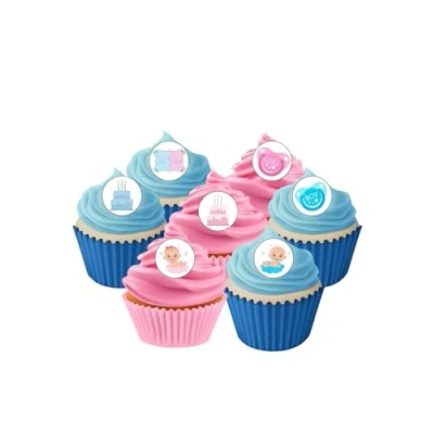 48 Gender Reveal Themed Edible Wafer Paper Cake Toppers Decorations - 2.5cm circles Just cut them out and then place them onto buttercream icing You will receive 48 Gender Reveal Themed Images which REQUIRE CUTTING OUT and are then ready to place straight on your cakes Fully edible with a shelf life of at least 12 months from purchase if kept dry Fully Edible - Wafer Paper ingredients - Water, Sunflower Oil and Potato Starch This product may have been in contact with allergens during the preparation and packaging process., Manufacturer: Orange Trading Dartmouth LTD