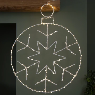 Illuminate your festive decor with the shimmering charm of this 48cm Light up Christmas Snowflake Bauble. This striking decoration features a sturdy silver metal frame, elegantly wrapped in micro LED lights that adds a magical glow to any room or space.. Measuring 48cm x 38cm in size, the snowflake bauble is illuminated by 250 warm white micro LEDs, with multi-action lights. The lights have 8 functions to choose from to suit the mood of any festive display. Mains powered with 5 meter power cable length from plug to product.. Suitable for indoor use and outdoor use.. Product Specifications. 250 Warm White LEDs. Height 48cm Width: 38cm. Mains Powered with 5m Cable