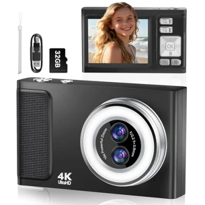【4K FHD Video & 48MP Photo Capture】 Equipped with 4K video and 48MP high-resolution photos, this digital camera for Photography captures sharp and smooth images with ease. This kids’digital camera also features multiple filters, providing wonderful, varied photography experiences. Perfect for family gatherings, birthdays, or casual weekend get-togethers, it helps you preserve everyday memories with a Point and Shoot Digital Camera. 【Compact Camera for Travel Adventures】 This 2.8 -inch LCD screen digital camera with the fill light allows you to take high-quality photos in low-light conditions, which is very light and small. You can easily put it in your pocket and carry it anytime, anywhere. This digital camera comes with a 32GB SD card, dust bag, USB cable and lanyard. A real small digital camera that's ready to use out of the box. 【16X Digital Zoom & Multiple Filters】This vlogging camera offers up to 16x digital zoom, letting you easily switch from shooting close-ups to capturing distant scenes. The built-in image stabilization function ensures photos stay clear and sharp. It features a standard 1/4-inch mount, which is compatible with most tripods, thus making it great for creators who want to shoot high-quality HD content hands-free for social media or their school projects. 【Smart Autofocus & Effortlessly Capture Any Scene】The autofocus function ensures that your subject is in sharp focus, whether you are capturing fast-moving subjects or fine detailed close-ups. Or whether you're at a friend's birthday party or a child’s sports event, the camera's autofocus system ensures you can easily capture every important moment. Simply press the shutter button halfway for precise focus, and press it again to snap the photo, thereby guaranteeing each shot is clear and crisp. 【Easy to Operate & Perfect Gift】This compact digital camera is ideal for boys, girls, and photography beginners. It features simple operations and is ready to use right out of the box. It helps children capture precious moments and create lasting, love-filled memories. It’s an excellent choice for gifting to family or friends on Valentine’s Day, Thanksgiving, birthdays, Christmas, and other holidays.