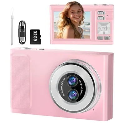 【4K FHD Video & 48MP Photo Capture】 Equipped with 4K video and 48MP high-resolution photos, this digital camera for Photography captures sharp and smooth images with ease. This kids’digital camera also features multiple filters, providing wonderful, varied photography experiences. Perfect for family gatherings, birthdays, or casual weekend get-togethers, it helps you preserve everyday memories with a Point and Shoot Digital Camera. 【Compact Camera for Travel Adventures】 This 2.8 -inch LCD screen digital camera with the fill light allows you to take high-quality photos in low-light conditions, which is very light and small. You can easily put it in your pocket and carry it anytime, anywhere. This digital camera comes with a 32GB SD card, dust bag, USB cable and lanyard. A real small digital camera that's ready to use out of the box. 【16X Digital Zoom & Multiple Filters】This vlogging camera offers up to 16x digital zoom, letting you easily switch from shooting close-ups to capturing distant scenes. The built-in image stabilization function ensures photos stay clear and sharp. It features a standard 1/4-inch mount, which is compatible with most tripods, thus making it great for creators who want to shoot high-quality HD content hands-free for social media or their school projects. 【Smart Autofocus & Effortlessly Capture Any Scene】The autofocus function ensures that your subject is in sharp focus, whether you are capturing fast-moving subjects or fine detailed close-ups. Or whether you're at a friend's birthday party or a child’s sports event, the camera's autofocus system ensures you can easily capture every important moment. Simply press the shutter button halfway for precise focus, and press it again to snap the photo, thereby guaranteeing each shot is clear and crisp. 【Easy to Operate & Perfect Gift】This compact digital camera is ideal for boys, girls, and photography beginners. It features simple operations and is ready to use right out of the box. It helps children capture precious moments and create lasting, love-filled memories. It’s an excellent choice for gifting to family or friends on Valentine’s Day, Thanksgiving, birthdays, Christmas, and other holidays.