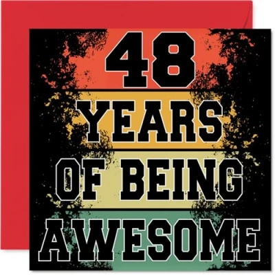 MAKE THEM SMILE WITH THIS UNIQUE BIRTHDAY CARD: This exceptional quality birthday card for him or her shows the design '48 Years Of Being Awesome'. If you are looking for special birthday greetings cards for Men birthday card then then this happy birthday card is bound to make them smile. Not just for birthday gifts for Men this could also be for Colleague, Dad, Cousin, Sister, Wife, Niece, Daughter or Uncle. WHAT DO YOU GET: The card is printed on one side and BLANK ON THE INSIDE to allow you to write your very own message. The unique fun design is printed on a specially sourced and environmentally responsible board. At 360 microns thick the natural white one-sided gloss board has a quality look and feel. Supplied with a coloured gummed envelope to complement the design and ready to be sealed and sent in the post. Great Colleague birthday cards, Dad birthday card. NO INK SMUDGES: There is nothing worse than writing inside a card to find that the shiny surface makes the ink smudge. This is why we use a high quality one sided coated board. The uncoated side will absorb more of the ink from your pen to make smudging a thing of the past. 48th Birthday card for Cousin, 48th Birthday card for Sister, 48th Birthday card for Wife. SIZES: Greeting Card = 145mm x 145mm, Envelope = 155mm x 155mm, Card Thickness = 360 micron. Niece 48th birthday card, birthday cards for Daughter, special birthday cards for Uncle, 48th birthday card Colleague, Dad 48th birthday card. MADE AND QUALITY CHECKED IN THE UK: We print and manufacture all our products right here in the UK so you can be sure of a fast turnaround and a product that is expertly made. Using environmentally responsible premium board our card is conscious of the responsible management of the world's forests - perfect birthday cards for Men, fun birthday cards for him, Dad 48th birthday cards, female birthday cards.