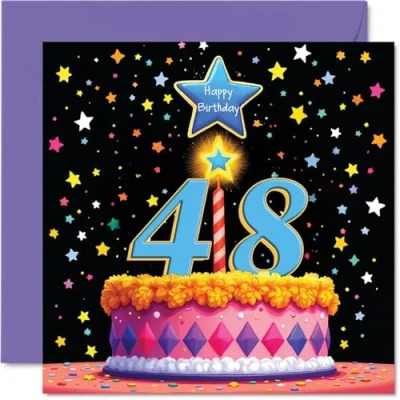 48th Birthday Cards for Men Women Pink Cake & Stars Happy Card 48 Year Old Man Woman Dad Son Husband Brother, 145mm Bday Greeting