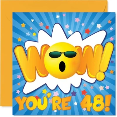 MAKE THEM SMILE WITH THIS UNIQUE BIRTHDAY CARD: This exceptional quality birthday card for him or her shows the design 'WOW Youre 48'. If you are looking for special birthday greetings cards for Men birthday card then then this happy birthday card is bound to make them smile. Not just for birthday gifts for Men this could also be for Colleague, Dad, Cousin, Sister, Wife, Niece, Daughter or Uncle. WHAT DO YOU GET: The cards are printed on both sides with the inside print saying '0' and ample space for your own personal message. The unique fun design is printed on a specially sourced and environmentally responsible board. At 360 microns thick the natural white one-sided gloss board has a quality look and feel. Supplied with a coloured gummed envelope to complement the design and ready to be sealed and sent in the post. NO INK SMUDGES: There is nothing worse than writing inside a card to find that the shiny surface makes the ink smudge. This is why we use a high quality one sided coated board. The uncoated side will absorb more of the ink from your pen to make smudging a thing of the past. 48th Birthday card for Cousin, 48th Birthday card for Sister, 48th Birthday card for Wife. SIZES: Greeting Card = 145mm x 145mm, Envelope = 155mm x 155mm, Card Thickness = 360 micron. Niece 48th birthday card, birthday cards for Daughter, special birthday cards for Uncle, 48th birthday card Colleague, Dad 48th birthday card. MADE AND QUALITY CHECKED IN THE UK: We print and manufacture all our products right here in the UK so you can be sure of a fast turnaround and a product that is expertly made. Using environmentally responsible premium board our card is conscious of the responsible management of the world's forests - perfect birthday cards for Men, fun birthday cards for him, Dad 48th birthday cards, female birthday cards.